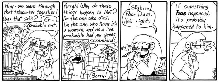 As soon as Dave and Helen went through the teleporter together, readers started speculating that it would probably cause trouble, but I put off the reveal for a while.
