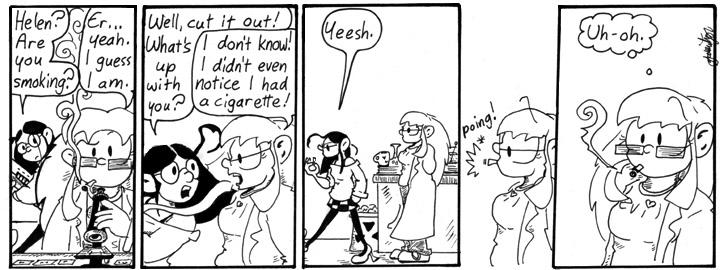 I still like this gag. It’s so dopey. I drew Helen’s cigarette smoke all fancy, but it doesn’t really have any special significance. I was just bored.