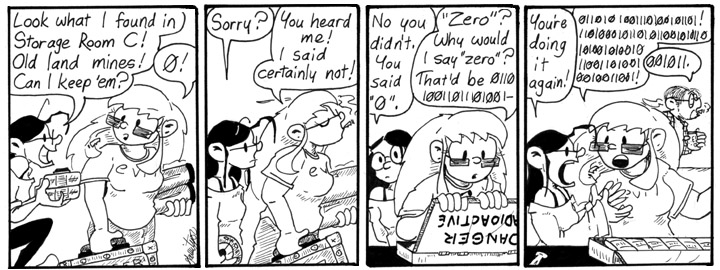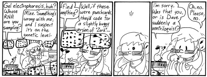 Helen’s discipline–genetics–and Dave’s discipline–computer programming–aren’t entirely different. They both involve a whole lot of code. I think this was the first strip I wrote for this storyline.
