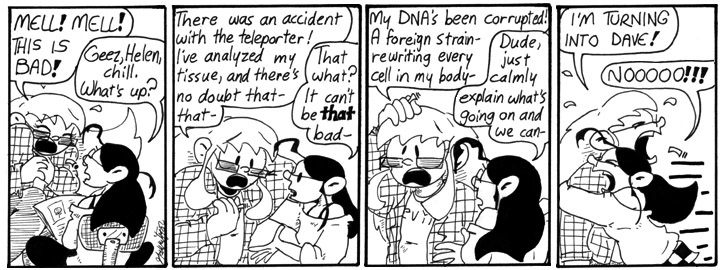 38. Eve: Yeah, it’s kind of hinted at in later strips in which Helen becomes aware that she’s losing her particular intellectual abilities but gaining Dave’s. It’s kept pretty vague, though.