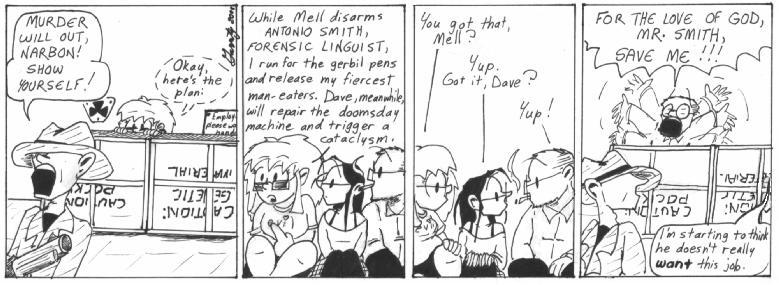I like that Mell is taller than ANTONIO SMITH here. He’s a tiny little guy in these early strips. I try to stay fairly consistent in the characters’ relative heights. Mell is 5’6″, Helen is 5’10”, and Dave is 6’1″. The characters tend to be tall because I’m tall; I’m the same height as Helen (and, as many people have helpfully pointed out to me, I’m generally built like her, except that I made her boobs bigger). Everyone starts from a base height of me.