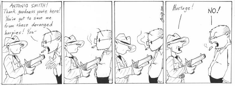 Also, it’s obviously the same gun, copied and pasted into each panel. I managed to do it pretty seamlessly here; I think I traced it to make sure it would fit onto ANTONIO SMITH’s arm in each panel. I don’t do those kind of shortcuts very often, but in this case I was very, very bad at drawing guns and needed all the computerized help I could get.