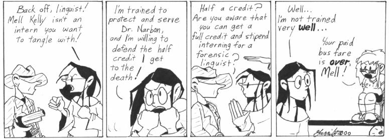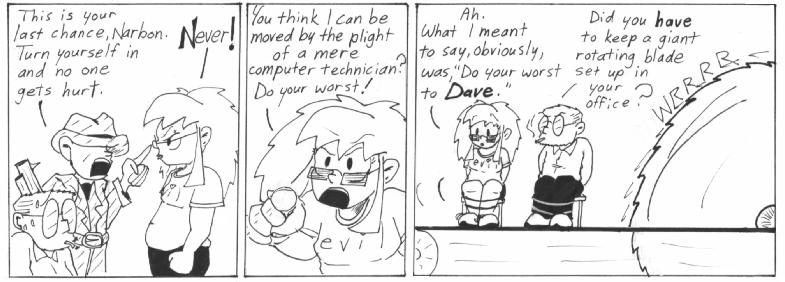 Aw, Mell looks so cool in the first panel. Actually, the art in this strip is pretty decent, all things considered. Mell is holding the first of many ridiculous retro space pistols I would draw over the course of Narbonic. I was obviously better at drawing these than real guns.