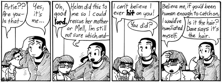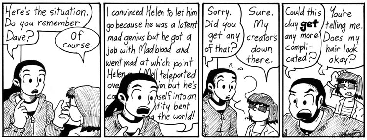 This is the second strip in a row about hair. I worried about that at the time, but what the hell, the characters do have awesome hair. I’m lazy sometimes.