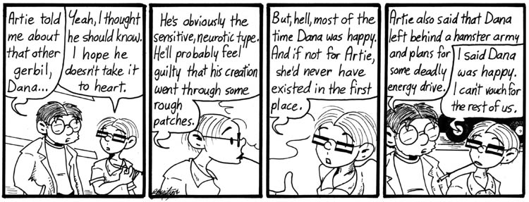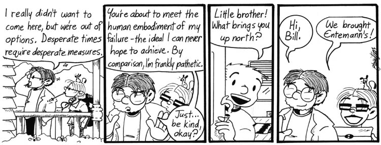 I still adore the concept of Dave idolizing his older brother out of all proportion to his actual features and accomplishments. It’s one of my favorite things in Narbonic. Not only is it entirely appropriate to Dave’s warped sense of self-worth, it plays upon one of my favorite comedy tropes: vicious rivalries in which only one party is aware that a rivalry is even going on. Rimmer’s hatred of his cool alternate-universe counterpart, Ace, in “Red Dwarf” was a definite inspiration here.