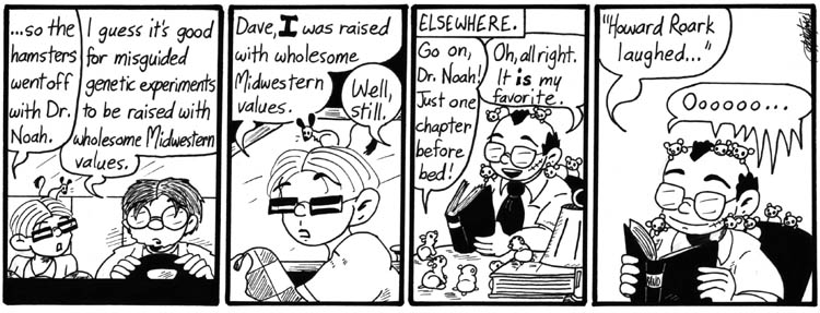 Dr. Noah was named after a friend of mine who’s a dedicated Objectivist, so I put in a lot of Objectivist stuff. At some point I settled on the idea that gerbils are left-wing and hamsters are right-wing. There was no good reason for this.