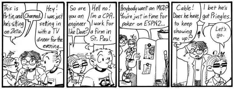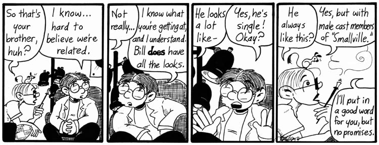 After introducing Bill at age seven in the time-travel storyline, I decided I wanted to work him into the strip as an adult. So here he is. As you can see, he looks almost exactly like Dave did at the beginning of Narbonic, before he got a better haircut. He smokes, though, which Dave never did. And he wears contacts.
