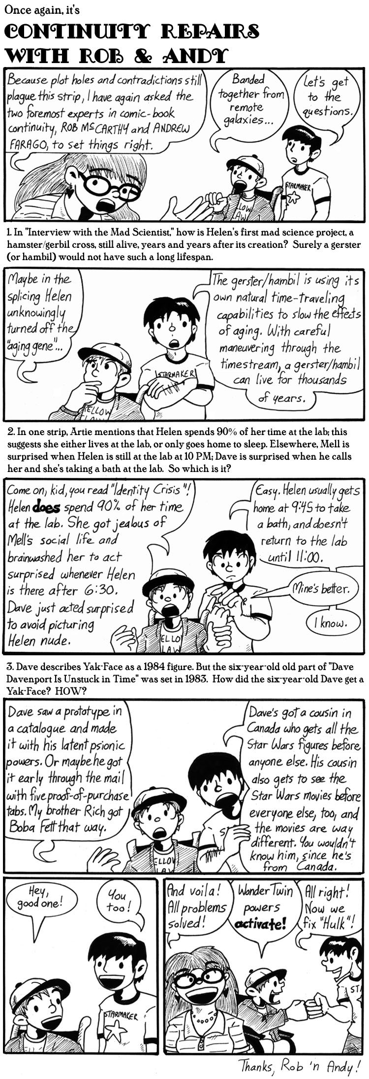 I know I said this last time a “Continuity Repairs” strip came up, but I loved doing these. Again, these are Rob McCarthy and Andrew Farago’s actual answers to the questions. My cartoon avatar looks especially deranged in this installment, which I like.