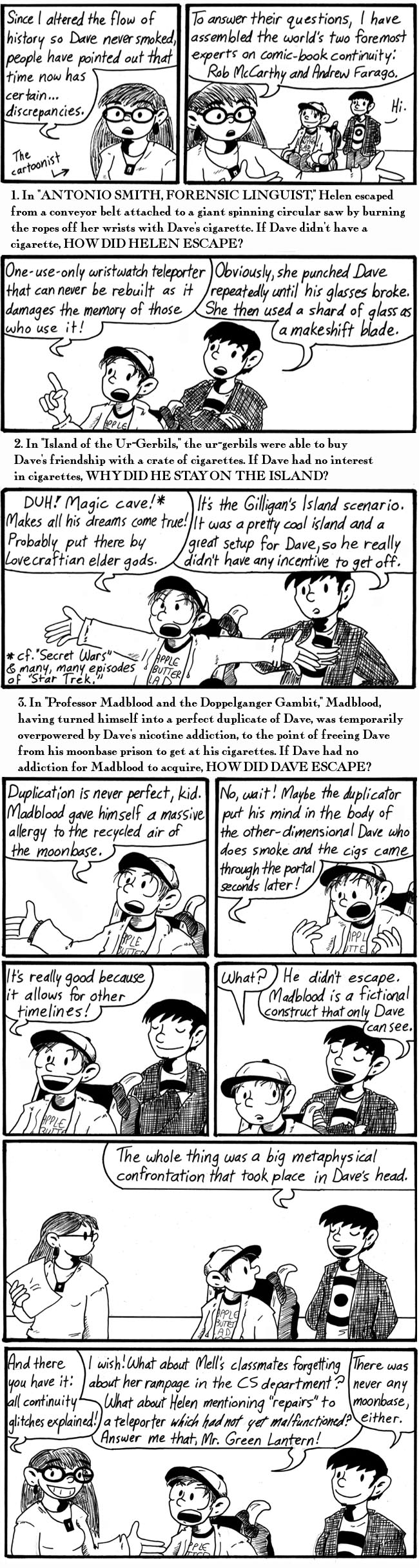 It’s basic many worlds interpretation! The early strips take place in a universe where Dave smoked, the strips since take place in a universe where he does not. There’s a timeline where Dave didn’t change the past and still smokes, and we don’t know what’s going on there now. In the current timeline, Dave doesn’t smoke, and the archive– being a record of the “Dave smokes” universe– doesn’t say what events led us here. Simple!