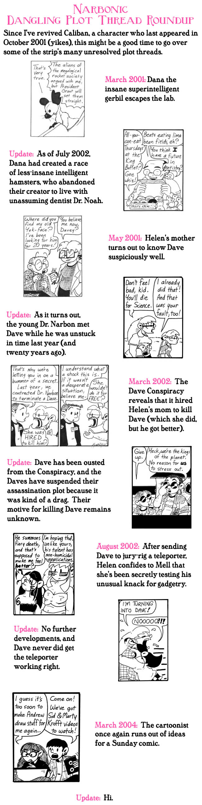 Many of these old plot threads get picked up over the course of “Demons” and the next storyline, “Mad Science Is Decadent and Depraved,” so I thought it’d be helpful to mention them again and jog readers’ memories. I never did a feature like this again, even though it might have been useful later on as well. Then again, we’re currently about halfway through Narbonic, which is as logical a time as any to do this.