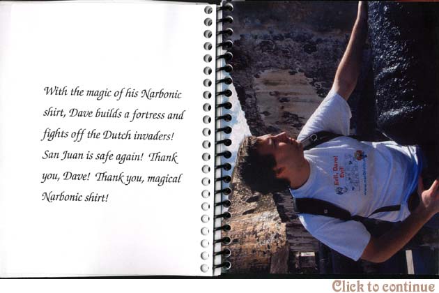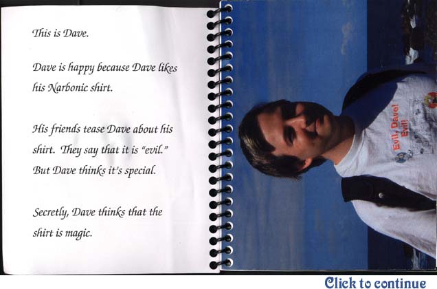 Dave is modeling one of several Narbonic T-shirts I made on CafePress back in the day. Actually, before I hooked up with CafePress, I made them myself with iron-ons and T-shirts that I bought from a guy on the sidewalk. Narbonic, as a small business, is lacking in certain areas, such as the area of consisting of anything beyond me, my apartment, and whatever I can scrounge within the surrounding ten blocks.