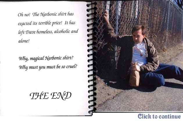 It’s true. I used to be sluggish and have weak joints. But when Ihad my Narbonic t-shirt, the world wrapped itself around me like awell-worn blankie. Sure, eventually it left me to die here in thestreet, but I’d make that decision again in a heartbeat!