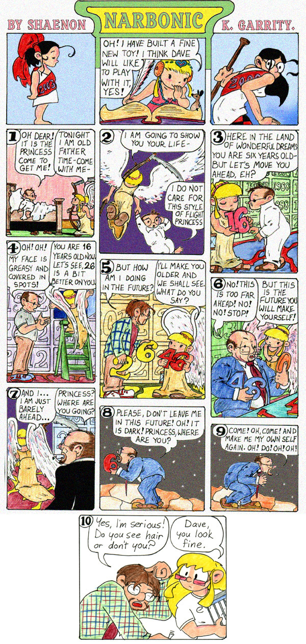 Each of the Slumberland strips foreshadows events in the coming year of Narbonic. This one is entirely about the time-travel storyline, “Dave Davenport has Come Unstuck in Time.” “Professor Madblood and the Doppelganger Gambit” went on for so long that, for a while, I worried I wouldn’t get to “Unstuck in Time” within 2003 and the impact of this strip would be ruined. Fortunately, I managed to wrap up “Doppelganger Gambit” by the end of July, allowing me to devote the second half of the year to “Unstuck in Time.”