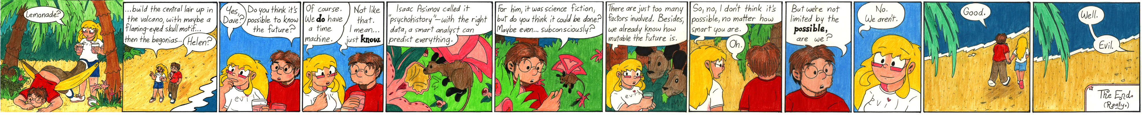 This isn’t my best coloring job, but what the heck. I managed to work in a few callbacks to previous Narbonic strips, including echoing the fakeout ending from the first trip to the island with a real ending this time. I knew for a long, long time that the last line of the strip would be “evil.”