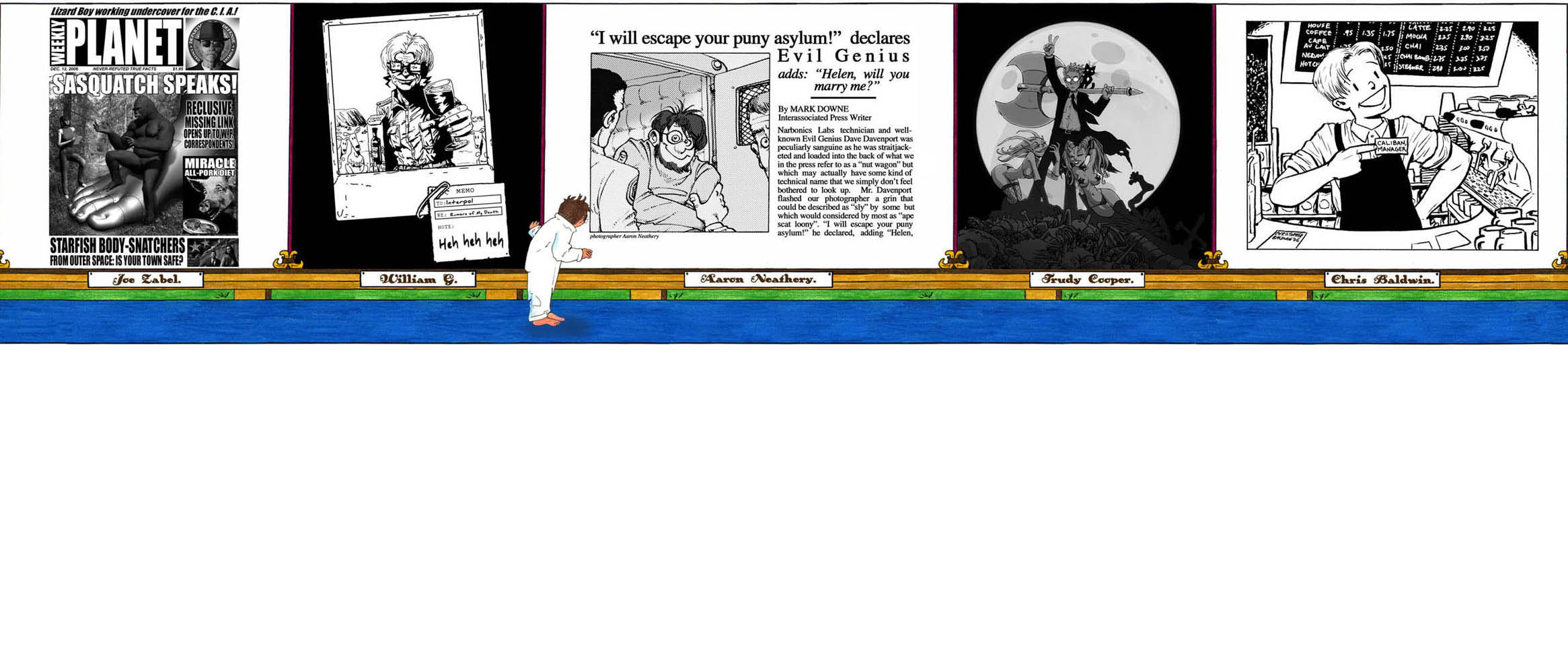 — Dave’s proposal to Helen, as depicted by Aaron Neathery, also comes up in a Narbonic story I gave away in the Narbonic: The Perfect Collection Kickstarter drive. Aaron did the first guest week for Narbonic (week-and-a-half, in fact), and he was one of the artists I absolutely had to have in this final montage. He wrote the newspaper text himself.