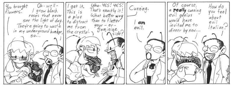 “Evil Italian” is a direct, if veiled, reference to Andrew Farago, the cute guy behind the counter at the Cartoon Art Museum, who by that point had become my best friend. I had a huge crush on him. He didn’t seem romantically interested in me, though, so by the time this strip ran I was dating someone else. I didn’t think I had a chance with the evil Italian. He was way out of my league. We hung out every weekend and emailed constantly, though.
