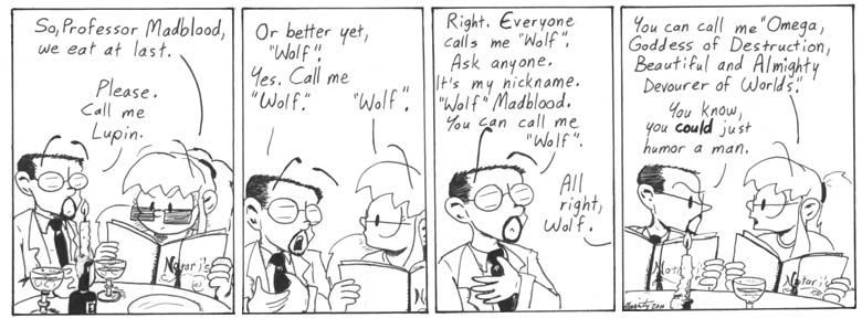 “So, Professor Madblood. We eat at last.”Hahahahaha!! Somehow I missed the bad pun all the other times I’ve read this strip. Classic!