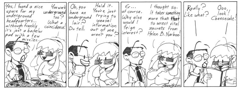 Damn it, I still like this strip. It’s not often that I managed to get clever with the wordplay like that. The poses in the first panel are, of course, bizarre, but it’s a rare attempt at full-length figures and some kind of vague background, so at least I’m trying. I rested up afterwards by just drawing talking heads for the next three panels.