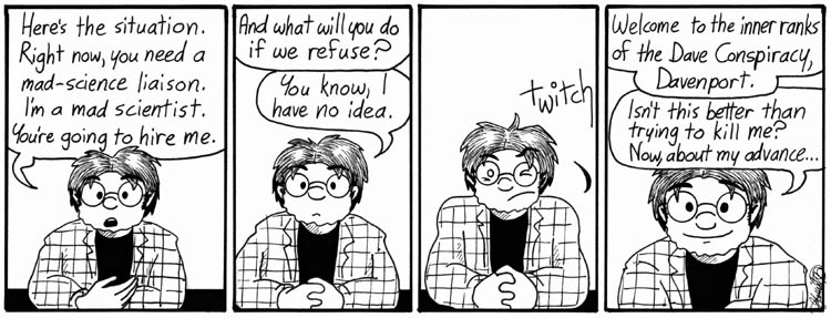 The implication here is that Davenport is the only Dave in the world who is a mad scientist. Which I guess is in keeping with the story of this comic, that Dave’s prior identity as “a guy named Dave” is so anathema to the trappings of mad science that his latent genius is a shocking revelation.