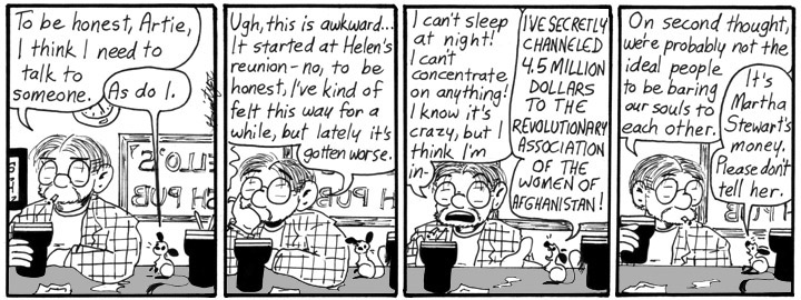 After this strip ran, someone emailed me to warn me that the Revolutionary Association of the Women of Afghanistan was a socialist organization. I really don’t think that would bother Artie. Much later in the strip, he gives money to a bunch of hamsters on stilts. Now that’s a bad idea.