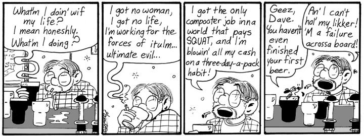 Okay, so I just like writing Dave drunk. He gets kind of belligerent. This strip is just silly, but I regret nothing but those horrible grey fills.