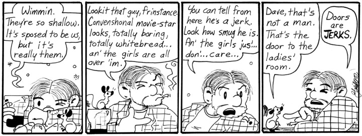 Dave has more than a touch of Nice Guy Syndrome, which I like to think he gradually loses over the course of Narbonic. I like that in this strip he seems to think his problem is that women don’t appreciate his unconventional good looks. You keep working it, Dave. Things will look up.