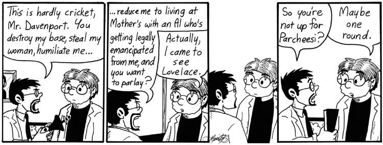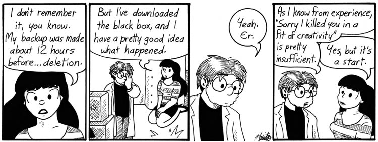 21. Hm. So, when Dave got killed, he had a spirit that went to Hell, so he remembers it all. Does/did Lovelace have a spirit too? And if so, is it recoverable? And, if it is recoverable, does this mean that in the Narbonic/Skin Horse universe, it would be possible to recover from computer crashes by holding a seance?