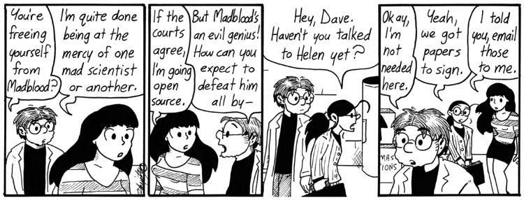 Aw, there’s a photo behind them of the whole gang in happier days. Or, if not happier days, less complicated ones. I used the photo again in a Narbonic story I did for the Couscous Collective’s SPACE anthology, currently out of print but someday to return in omnibus form.