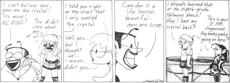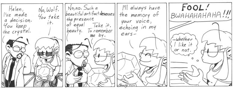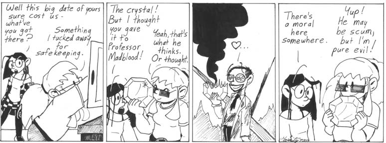 Of course, if Helen had REALLY wanted to mess with Madblood’s head, the fake crystal would have been a cyrstal-shaped gerbil who would then be gnawing on Madblood’s head in Panel 3. Same amount of explosive destruction, naturally.