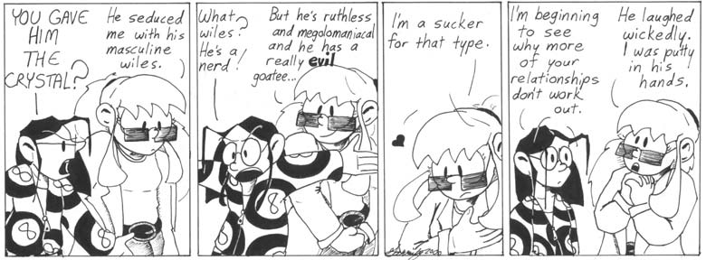 This was one of the first strips I wrote for this storyline. I wrote Narbonic all out of order, filling in strips whenever I thought of a gag or a new plot twist; in the later storylines, there are adjacent strips that were written literally years apart. I think most of “Crystal of Marinia” was written around this strip. I also think Helen’s dialogue is maybe a little out of character here, because it was written very early on.