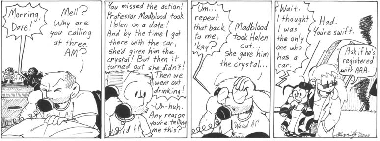 In the background of the first panel, we’ve got Dave’s beanie Darth Maul again. To my vast surprise, I’m able to remember that the other object is an action figure of that gross bloated guy from the David Lynch “Dune” movie. They used to sell those in the Archie McPhee catalog, which I got for years when I was a kid. The book behind them is Hogfather, my favorite Discworld novel (except on the days when it’s Small Gods or Witches Abroad). Dave is wearing a “Weird Al” Yankovic t-shirt, because he’s just that cool.