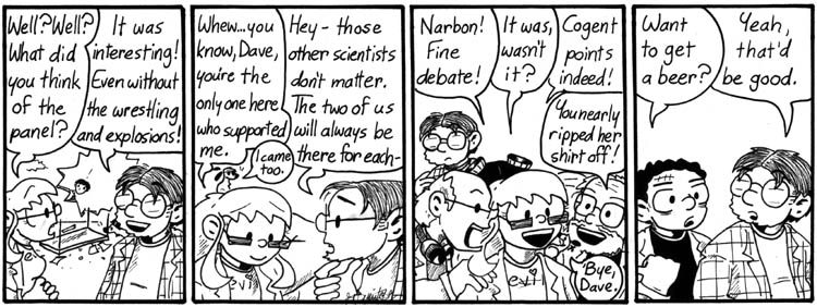 The guys in the third panel are based on a couple of scientists I met at Fermilab. I think Phil Foglio likes to draw them into his comics, too, so I’m not being too original here. Oh, and there’s my husband peering through the hole in the wall in panel one.