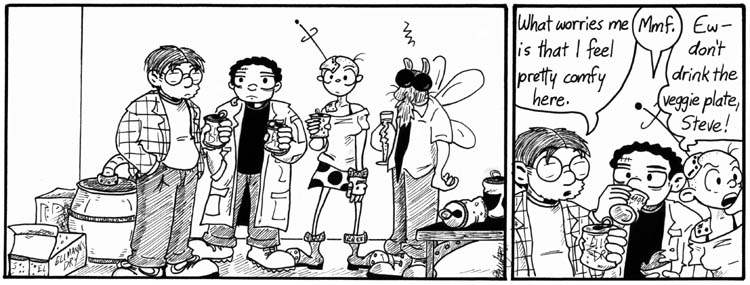3. Perhaps it’s because I’ve been reading Kaja Foglio’s LJ archives recently, but when you mentioned including your husband in this strip I started looking for someone in a bowler hat.
