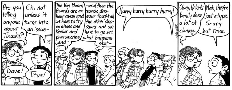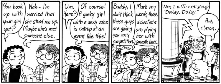 Obviously, the best part of this strip is the background of the third panel, where the fly-head guy from Thursday’s strip is licking the head of the cyborg girl. Flies are awful, aren’t they?