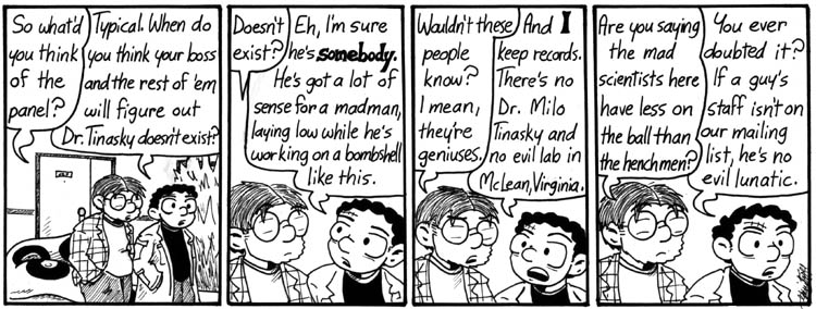 I chose McLean as the purported location of Tinasky’s lab as a reference to my favorite pseudonymous writer, sci-fi author James Tiptree, Jr., a.k.a. Alice Sheldon. This strip was drawn well before Julie Phillip’s wonderful 2006 biography Tiptree: The Double Life of Alice B. Sheldon, and it was a bit of a challenge to find out where Sheldon had lived. I ended up finding a copy of her obituary with the information.
