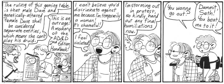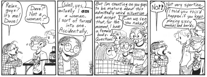 4. One thing I like about this sub-storyline is that, whatever their issues with the female of the species might be, the whole gaming group immediately and without question accepts the idea that this strange chick is, in fact, Dave transformed into a woman. No Weirdness Blindness for the gamers, thankyouverymuch!