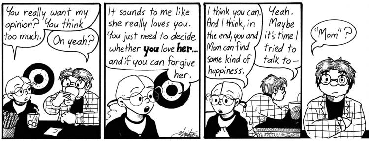 In this and the rest of the strips this week, Dave and his daughter mirror each others’ expressions and gestures. I wanted to subtly suggest the relationship between them.