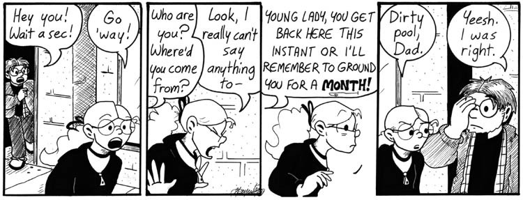 I like how much she lets slip about her absurd super-science family in just a few panels. A ridiculous future fantasia, the continuation of the silly adventures Dave and Helen have been on in just these six years.