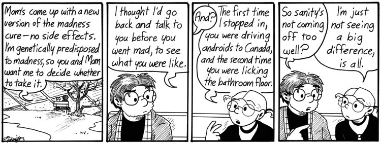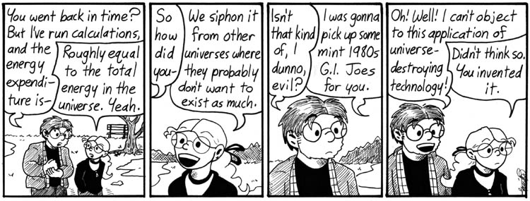 I have to say, like John, the line in the second panel is one of my favorite in all of Narbonic. After all, if they haven’t figured out a way to prevent their universe from being destroyed, or destroyed this one first, they obviously don’t care as much as we do! Seems like a pretty solid justification to me.