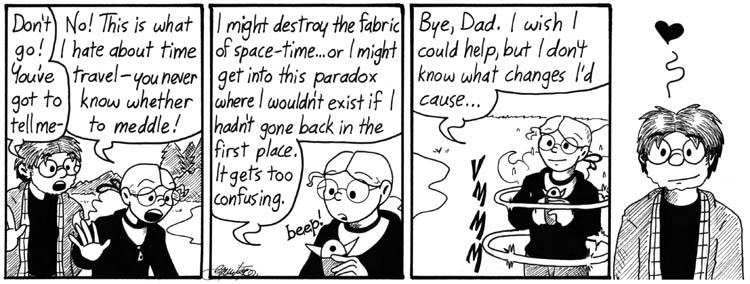 I like the fact that the strip’s time travel constraint has been resolved in the future, just like how genius madness has been resolved. The universe’s science constraints are falling away like torn paper at this, the end of the show.