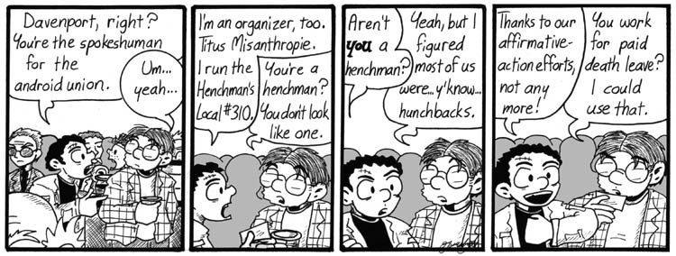 And here’s Titus Misanthropie, henchman nonpareil, created by Jonathan Towne for the playtest of the never-completed Narbonic roleplaying game. I love this guy so much. Most of the other characters in the first panel are other characters from the playtest.