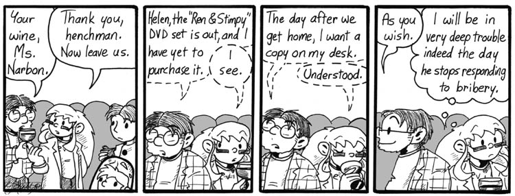 The bonus story in Narbonic Volume 4, drawn by Laura Chapple, features Dr. Narbon’s long-gone henchman, Pericles (who, at the point at which the story takes place, has been turned into a large African grey parrot). I intended for him to be a relative of Titus. The Misanthropies are an old henching family.