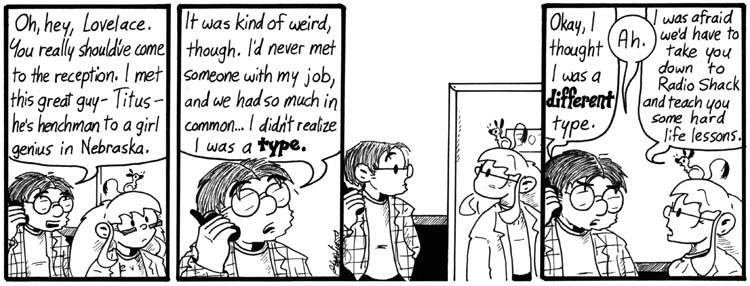 It took me a while to get the hang of drawing Titus, but what the hell, he looks pretty good here. The key is to always give him shifty eyes. He’s very expressive compared to Dave, who’s nearly always impassive behind those glasses. Around this time I was very interested in making my characters “act,” something that’s still the funnest part of drawing for me.