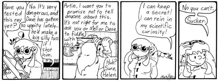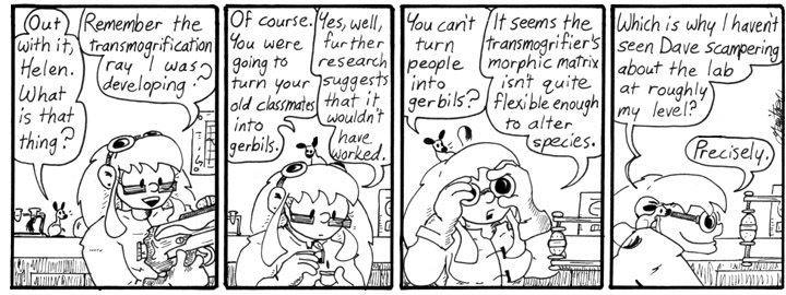 This is all tangential to this particular strip, which was written fairly early (although still long after that first, lonely strip) and just serves to slowly introduce Helen’s improved transmogrifier. It also features the first in a series of amusing goggles Helen wears this week.