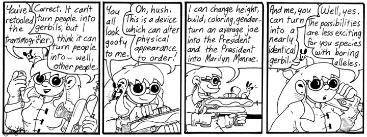 More important, the design of the transmogrifier is clearly based on a Super Soaker. I wasn’t at all consistent about this, but I tried to give Helen’s inventions the look of colorful toys. If I were doing the strip over, I’d give each of the mad scientists a distinctive design style. Madblood would be all steampunky.
