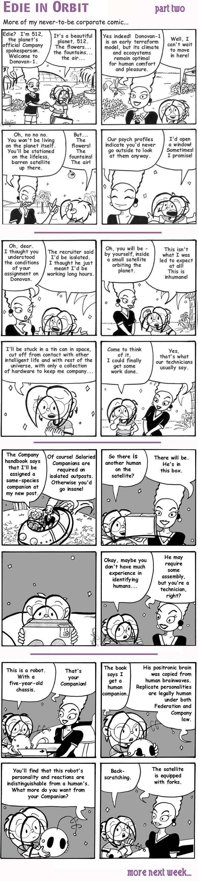 I wanted 512 to have an old-school “Star Trek” look; that’s why she wears a minidress and boots. I didn’t end up drawing the strip long enough to get very good at drawing her, unfortunately. Oh well.