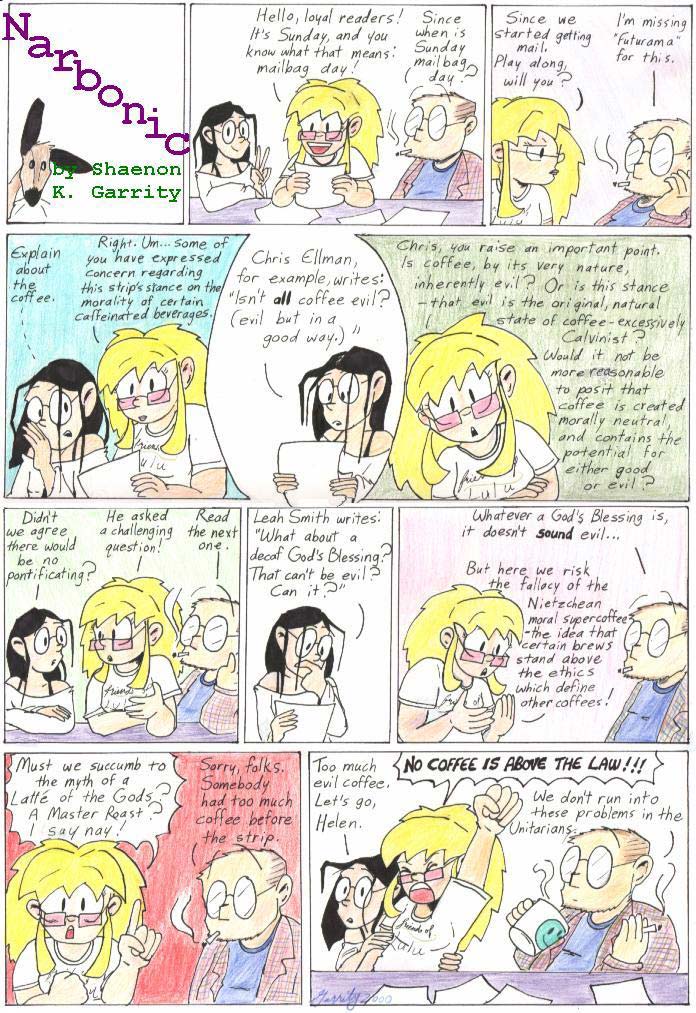 Dave’s skepticism about the “mailbag day” concept turned out to be well founded. I ended up doing about three of these, total, over the entire course of the strip. I think this was partly because the eventual creation of a Narbonic mailing list and message board alleviated the need for a mail forum in the strip itself, and mostly because it required me to draw a lengthy, full-color Sunday strip. I’m extremely lazy, doubly so on weekends.