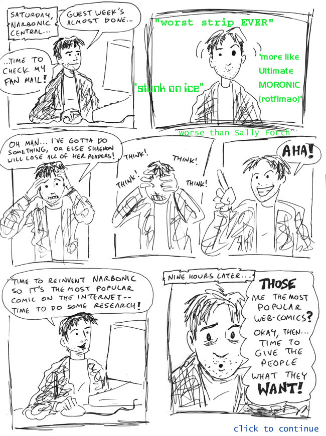 ANDREW FARAGO WRITES: This wraps up the week’s worth of Narbonic fill-in strips that I did. My lettering’s not too bad in that last panel, and I managed some pretty expressive faces, so that’s good. I’m a little bit better at drawing now, as seen in my current comic, The Chronicles of William Bazillion, which updates every Wednesday. Check your local listings for the time and channel.