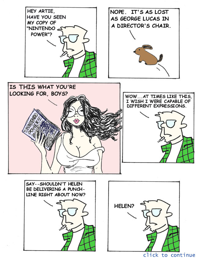Y’see, at the time, my impression of webcomics was that the most popular strips, apart from Shaenon’s comic, consisted of slick drawings that were cut-and-pasted over and over again because of lazy artists; vapid, large-breasted women; video game references; crude drawings and bad coloring; Star Wars references in place of actual punchlines or insight into the human condition or actual comedy; with clumsy usage of computer fonts instead of the much superior and artistic hand-lettering.