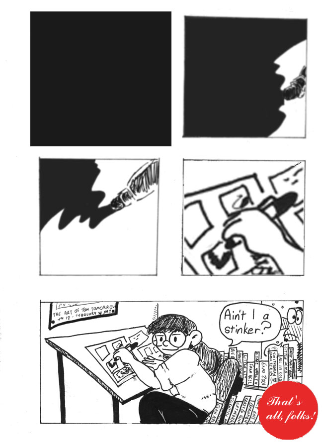 The background in panel five contains a poster for a Tom Tomorrow exhibition that had taken place at the Cartoon Art Museum in the late 1990s, a sampling of comics that were on our bookshelf in 2002, and a large sketch by Keith Knight that is still in our apartment, although it’s mostly hidden behind a bookshelf these days.